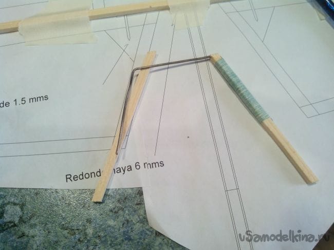 Из стальной проволоки и реек делаем с помощью ниток на клею делаем деталь, названия которой я нигде не нашел, - она нужна для соединения половинок руля высоты.