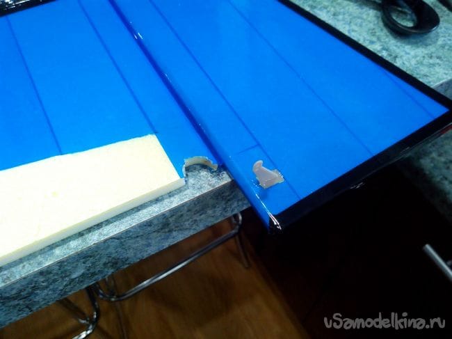 Заклеиваем заднюю кромку черным скотчем и делаем в нем надрезы по щелям для петель элеронов.