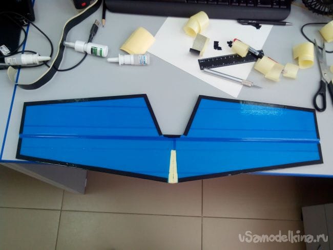 Далее наклеиваем снаружи на депрон скотч в районе лобика крыла.
