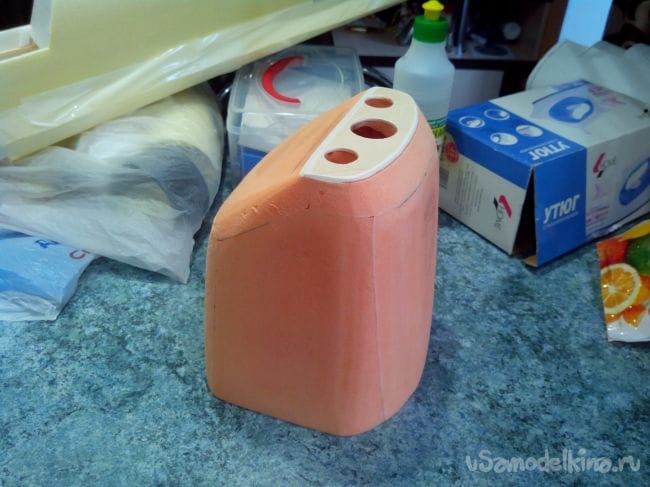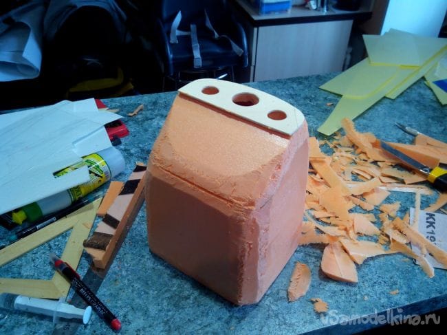 Из фанеры выпиливаем носовую часть капота и приклеиваем к куску пеноплекса.