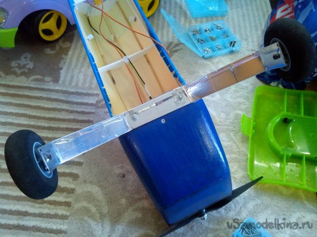 В фанерной площадке, в хвосте, сверлим отверстие, шилом протыкаем стабилизатор и киль, насколько достанет, и вклеиваем шасси на эпоксидке.