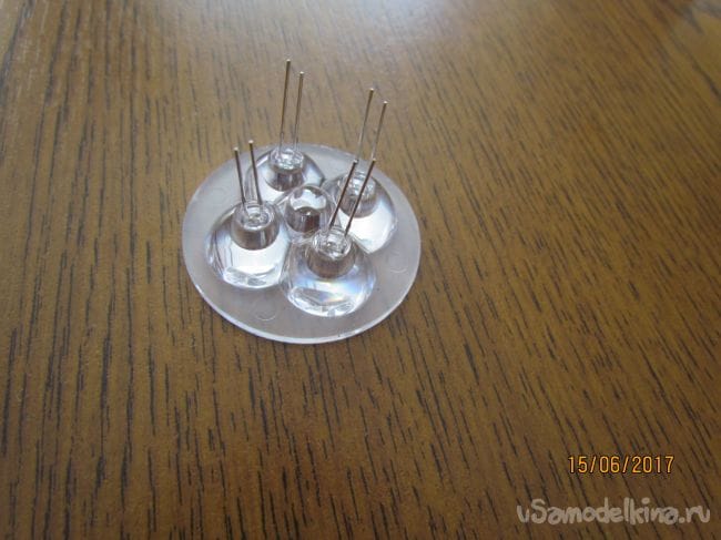 Вставляем светодиоды в линзу и соединяем параллельно. Светодиоды фиксируем клеем.