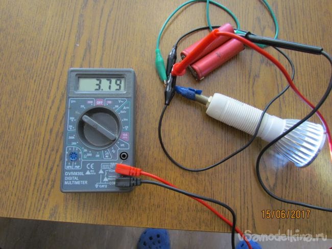 От двух батареек лампочка горела 24 часа. Напряжение к утру снизилось до 2,3В.