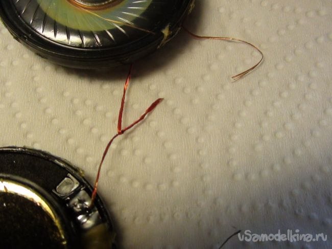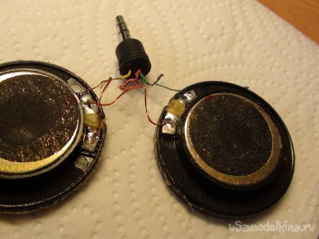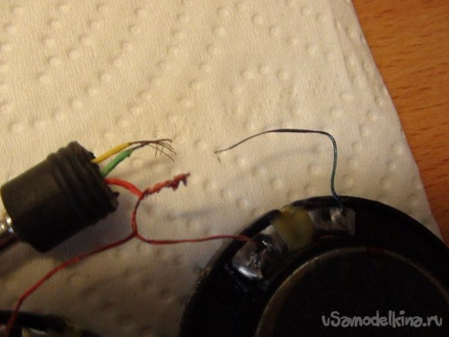 Спаиваем провода между штекером и динамиками.