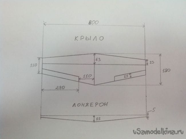 Крыло будет симметричным, относительно двух осей, а потому его будет проще начертить на потолочке, чем сделать шаблон. Размеры на схематичном рисунке.
