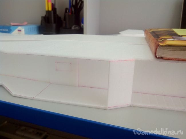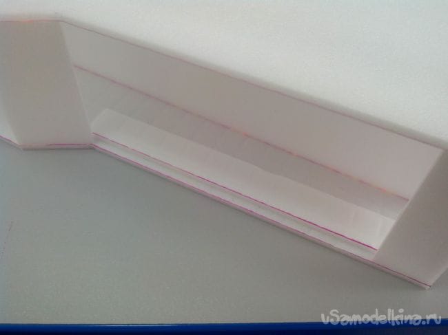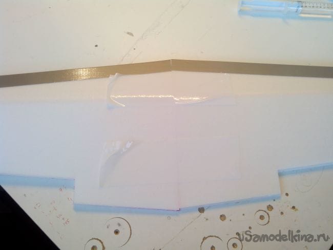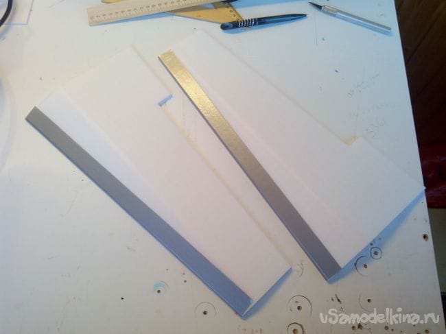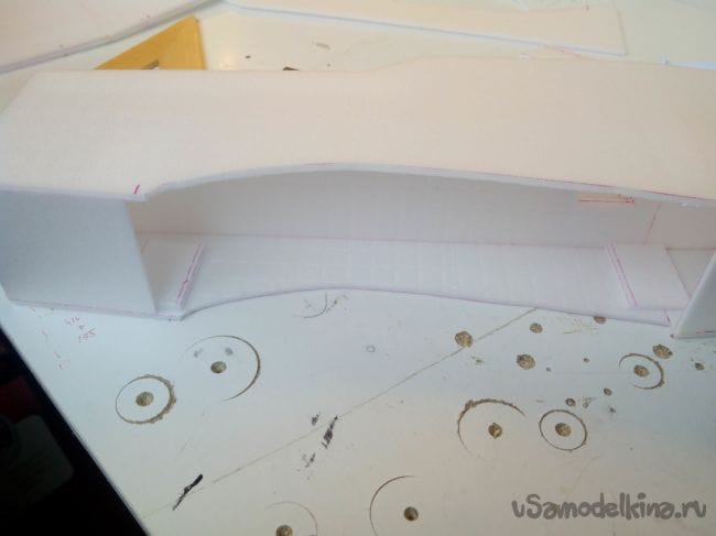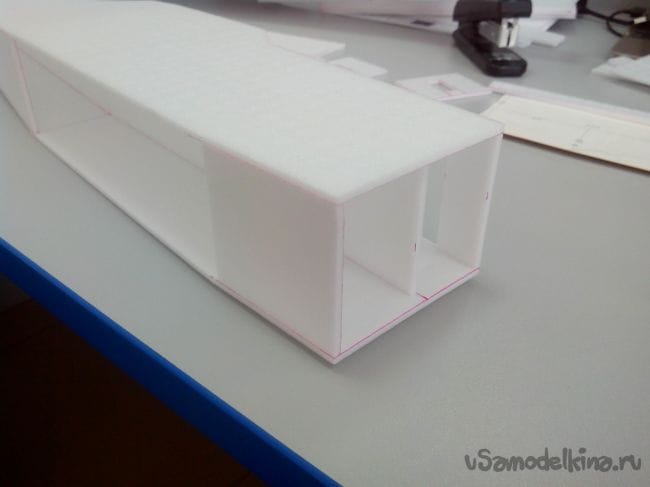 Внутри отсека под электронику (носовая часть) вклеиваем ограничители из полосок потолочки, чтобы крышка не проваливалась.