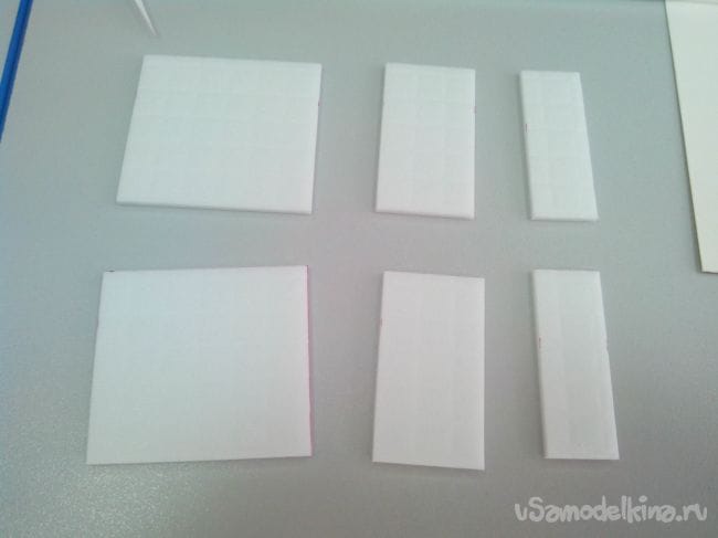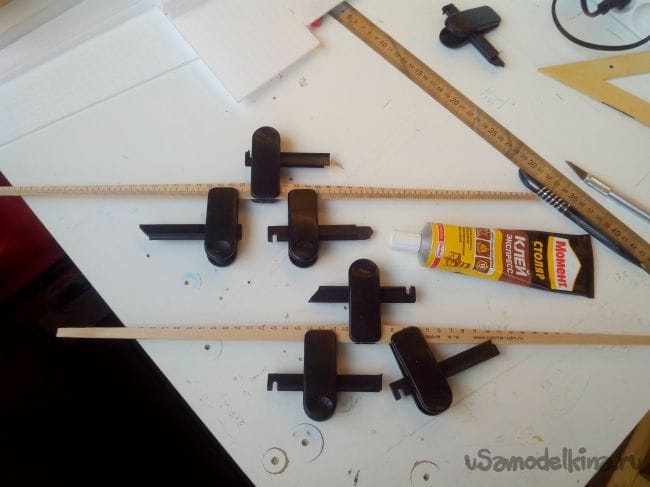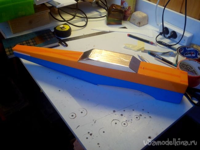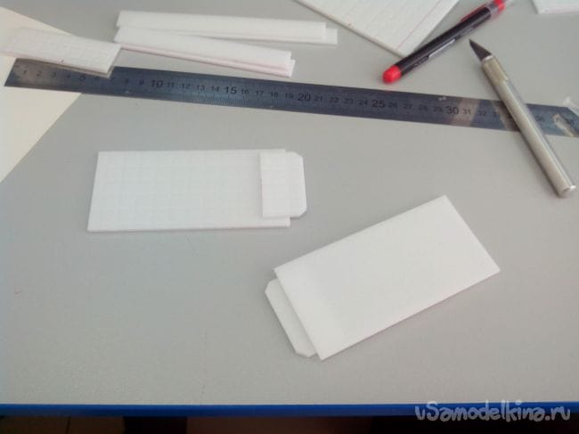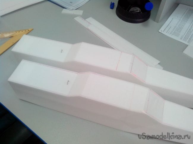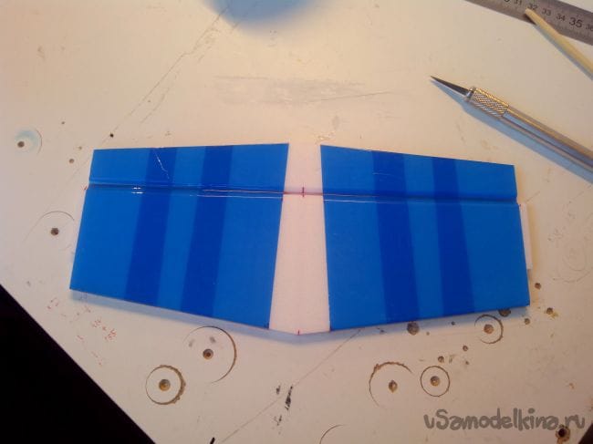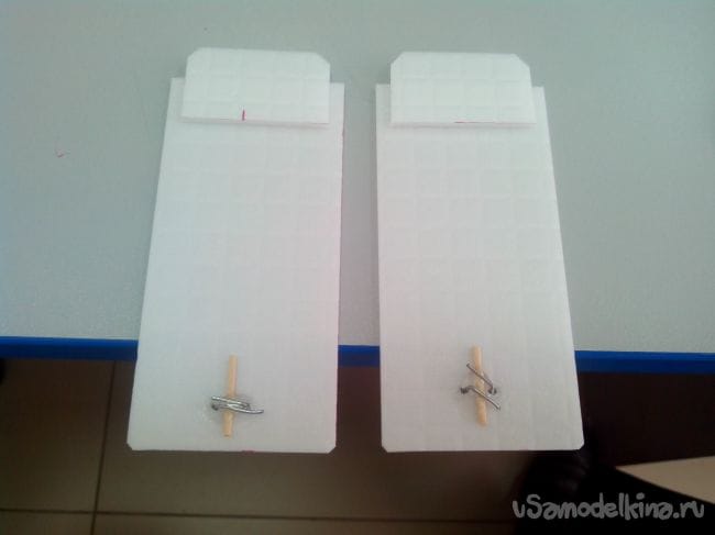 Вырезаем место под крыло и вклеиваем внутрь прямоугольники из потолочки в местах, где будут бамбуковые палочки для резинок.