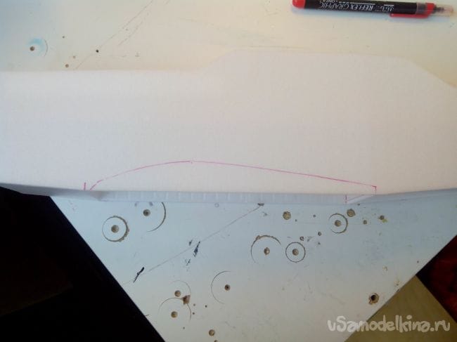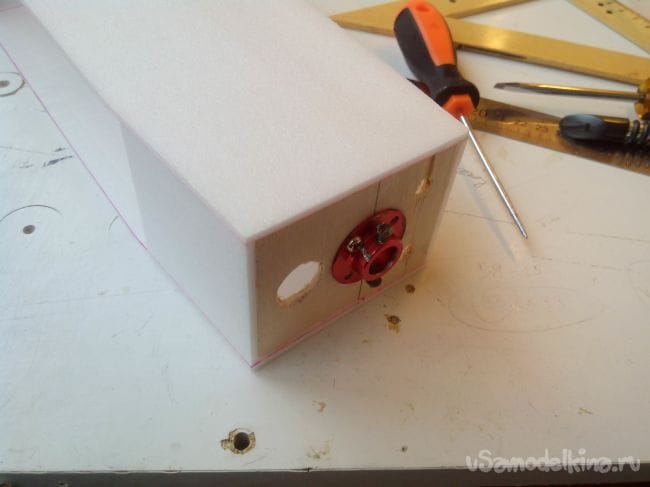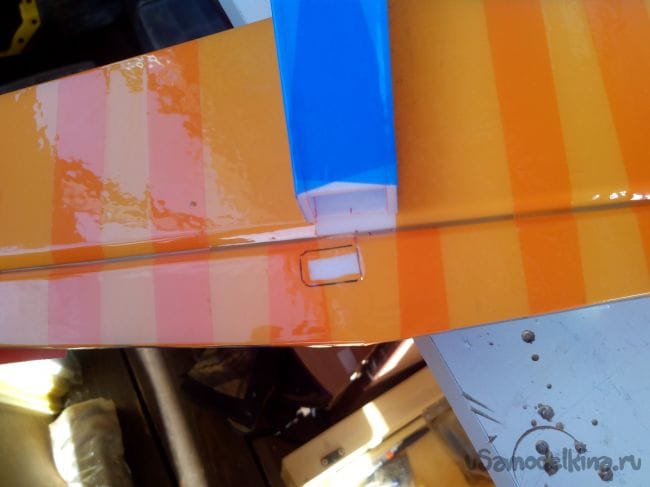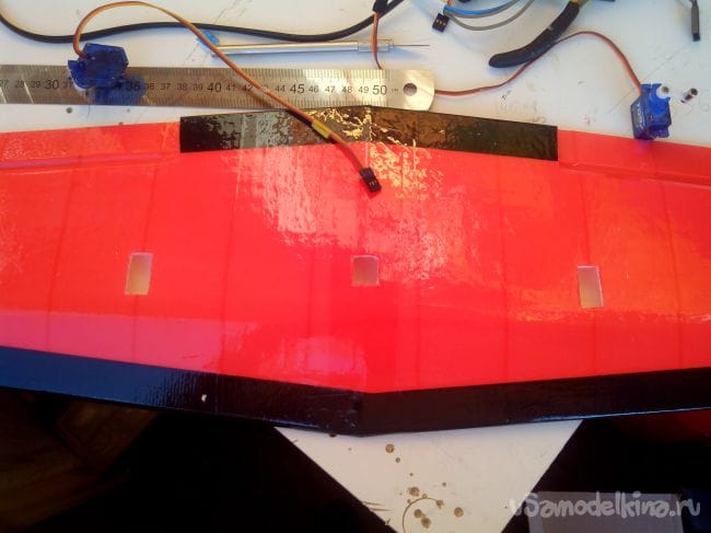 Сверху делаем в крыле отверстия под сервоприводы элеронов и провода.