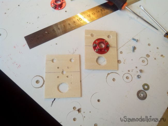 Из тонкой фанеры выпиливаем моторамы и прикручиваем к ним основания моторов.