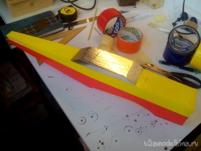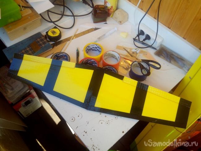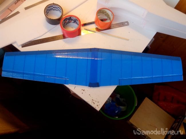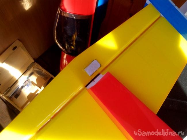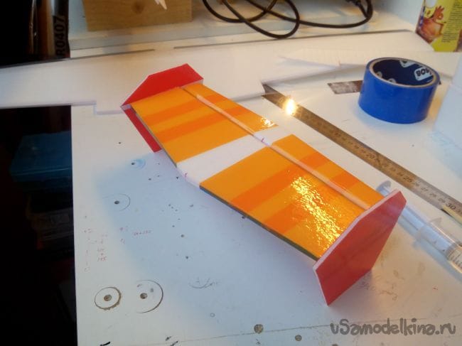 Обклеиваем стабилизатор скотчем, делая петли для руля высоты, по аналогии с элеронами. Цвета – как у крыла.