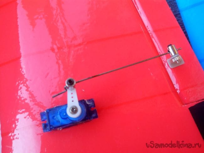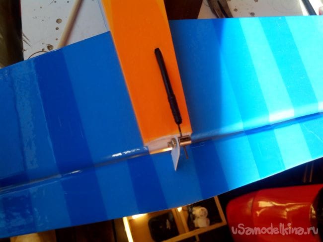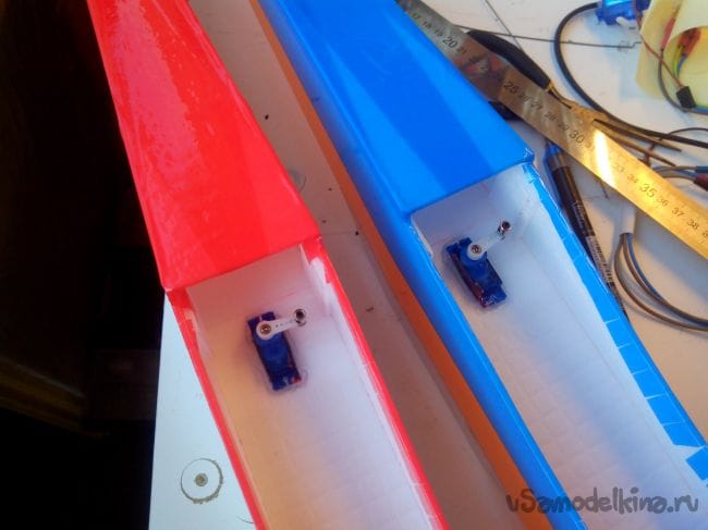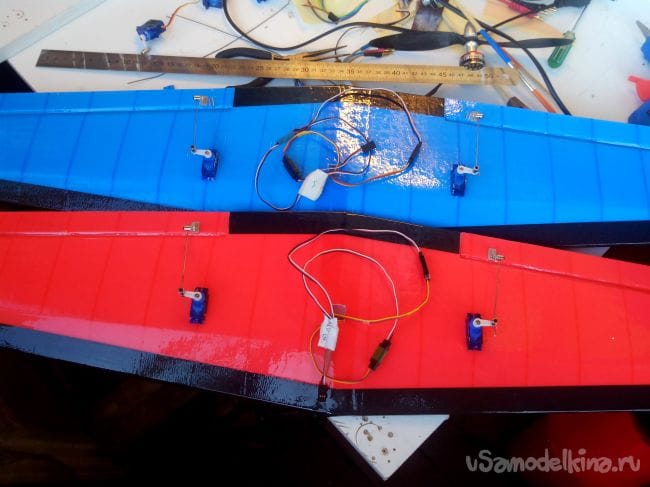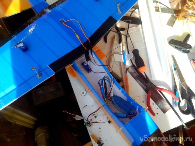 Закрепляем кабанчики на элеронах, делаем тяги из стальной проволоки и вклеиваем сервоприводы в крыло. Провода от сервоприводов можно протащить с помощью пинцета