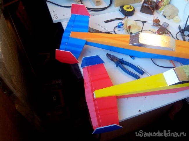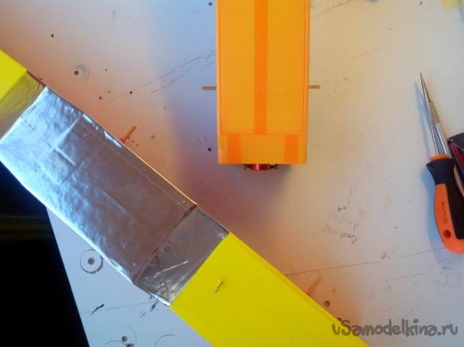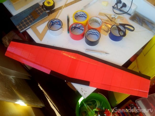 Можно обклеивать фюзеляжи скотчем. Верх и низ – разного цвета, для хорошей читаемости. Кроме того, каждый самолет своего цвета – чтобы не путать их в бою. Псевдокабину обклеиваем металлическим скотчем.