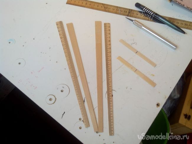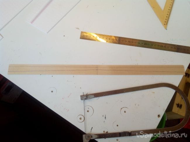 Размечаем на деревянной линейке лонжероны сразу для двух крыльев.