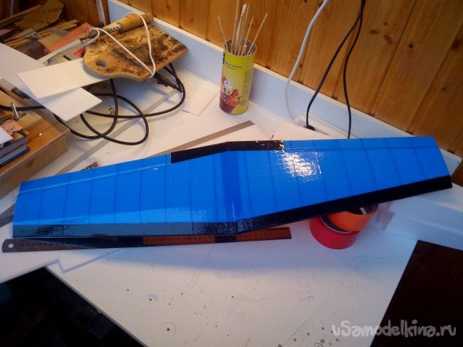 После высыхания клея вставляем лонжерон в половинки крыла плоской частью вверх. Вклеивать его в крыло не обязательно, будет проще ремонтировать после аварий.