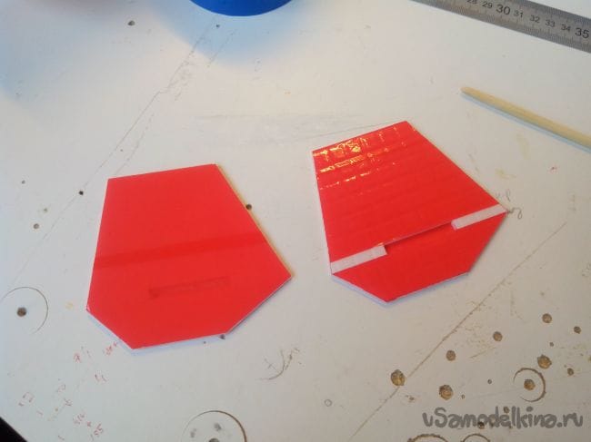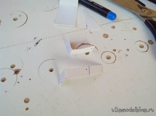 Склеиваем стабилизатор и руль высоты из вырезанных деталей и сошкуриваем под углом 45 градусов. Кили будут в один слой потолочки