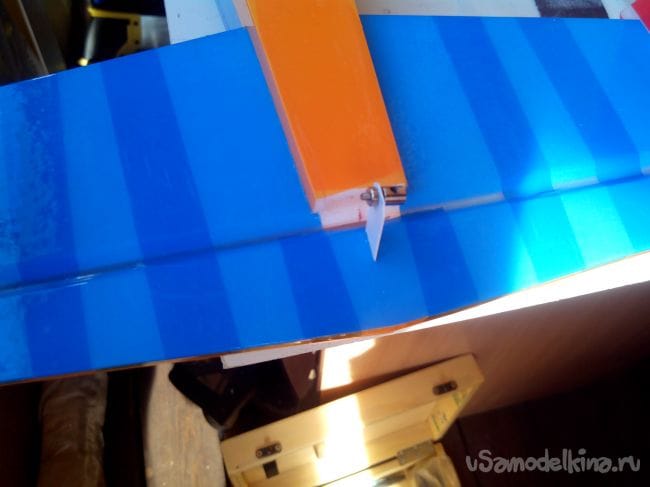В руле высоты резаком делаем щель и вырезаем часть скотча, чтобы кабанчик приклеить непосредственно к потолочке.