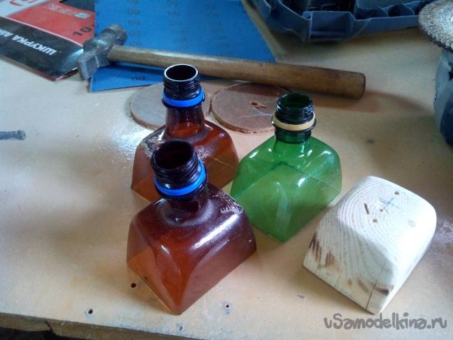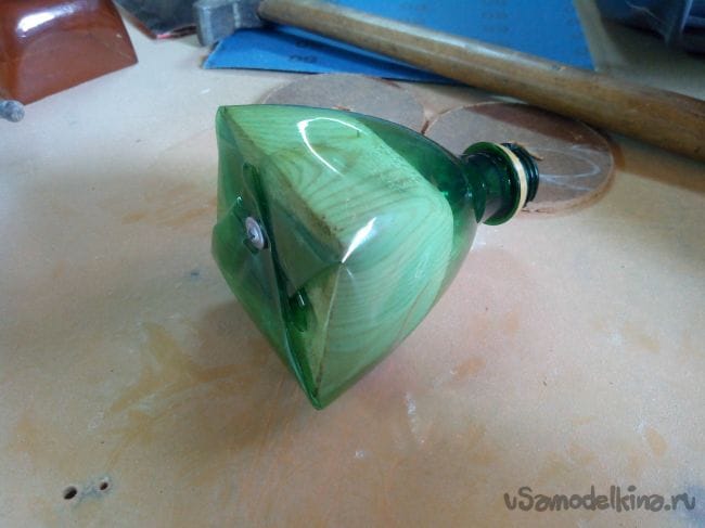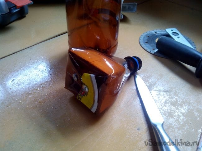 Затем вставляем в пластиковую бутылку (на 1,5 литра), загибаем края бутылки и фиксируем их саморезами.