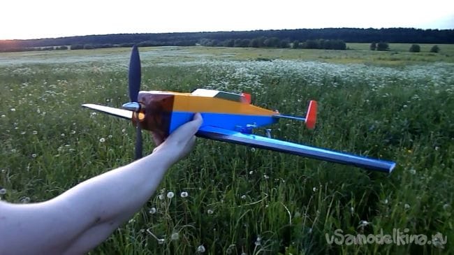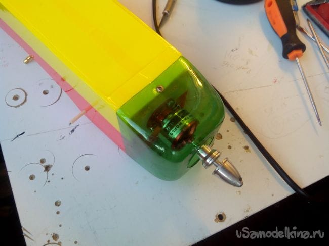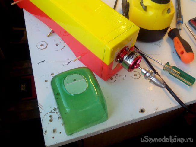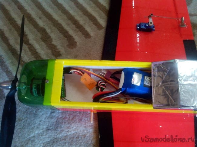 Внутри фюзеляжа снизу в полке делаем небольшое отверстие для вывода проводов к приемнику и аккумулятору. Регулятор подключаем к мотору и выводим провода в отсек с электроникой. Дополнительно его фиксировать не нужно.