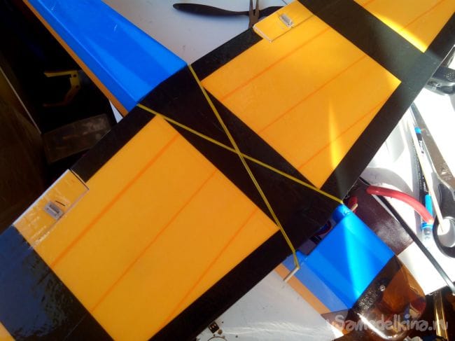 Крыло закрепляем резинками крест-накрест. Как показал облет – двух резинок достаточно.