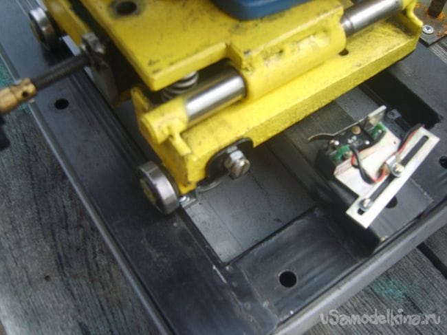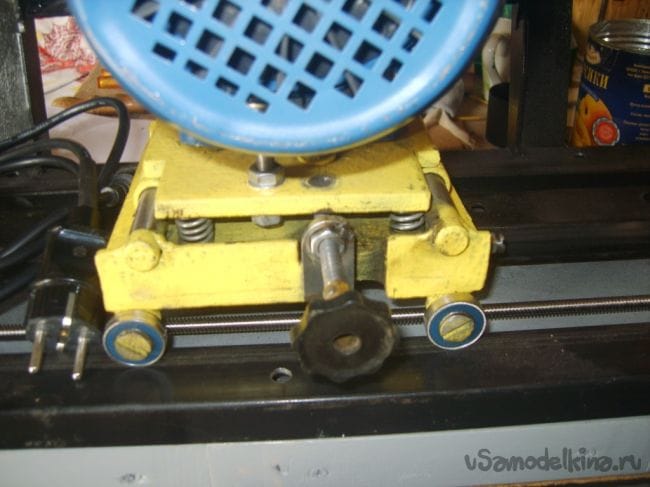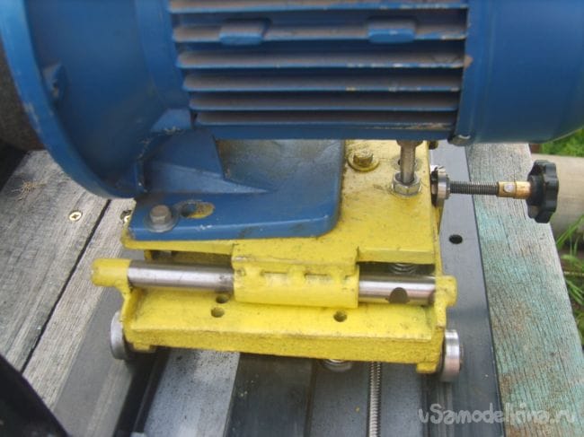 К нему, после соответствующей обработке, установил направляющею пластину, на которой закрепил электродвигатель на три точки. Одна из них регулировочная. Направляющая пластина, относительно опорной, закреплена подвижно на двух поршневых пальцах от москвича, валики (направляющие валы) точно подошли от коробки передач УАЗа. Для подачи точильного камня к детали (ножу), имеется винт с мелкой резьбой.