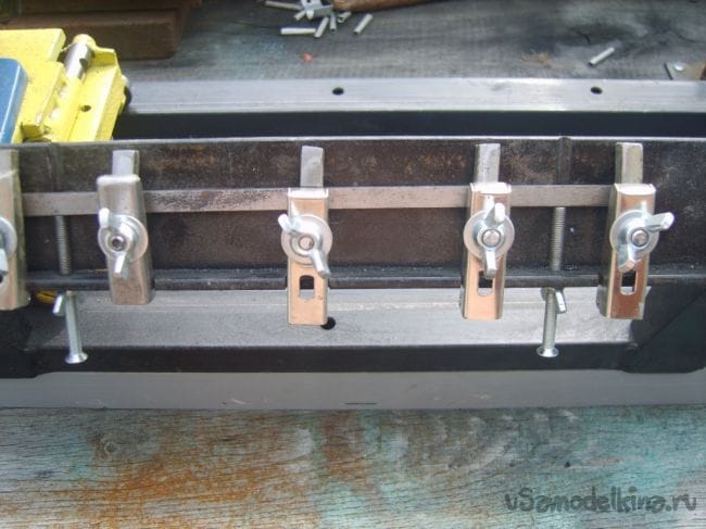 Нож закрепляется в специальном устройстве, которое может менять угол заточки. Для строгальный ножен он должен быть 45-60 градусов. Для крепления ножа к устройству, применил от мебельной гарнитуры навесы.
