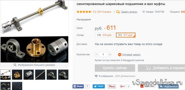 Вал, для перемещения каретки пришлось выписать у китайцев набор, который меня вполне устроил. Набор состоит из вала (60 см), подшипников, соединительной само-центрирующей муфты, направляющей втулке.