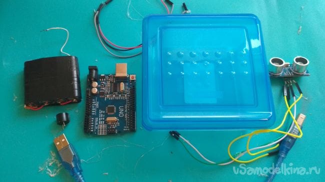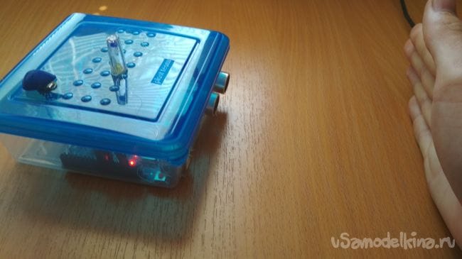 }Теперь остаётся только включить нашу сигнализацию и протестировать её, сигнализация запрограммирована таким образом, что если приблизить какой либо твёрдый объект к ультразвуковому датчику то зуммер сразу начнёт пищать и светодиод светится. К примеру если поставить его незаметно на пол и кто-то мимо него пройдёт то зуммер сразу начнёт пищать. (светодиод у меня в последствие згорел из-за того что я забыл припаять к нему резистор на 220 Ом, так что если будете делать обязательно припаяйте)