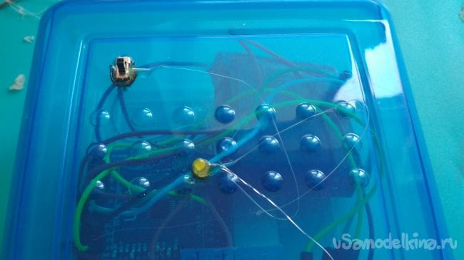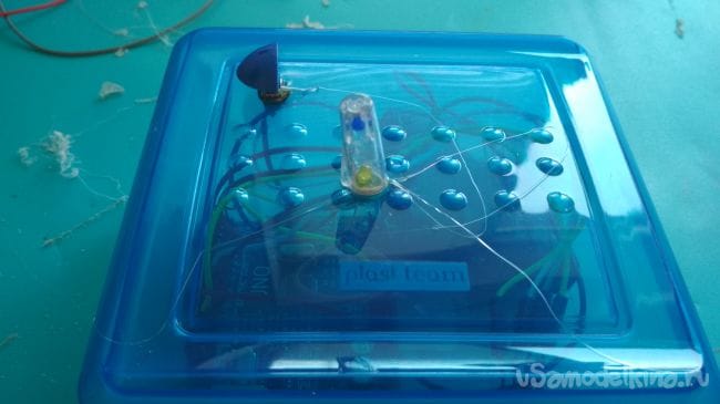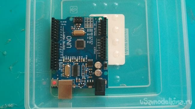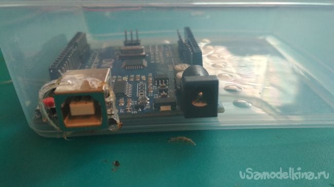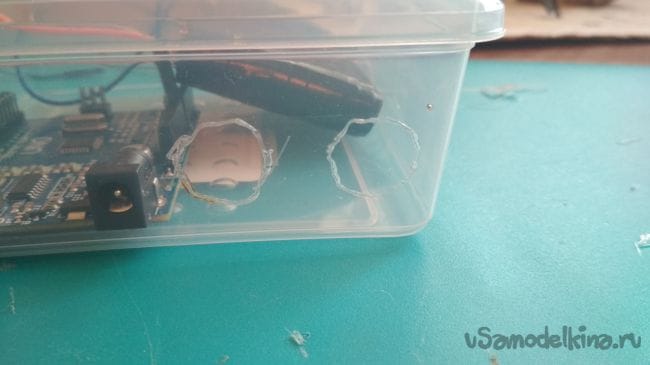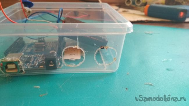 Первым делом нужно расположить плату Ардуино в контейнере, затем отмечаем место под отверстие для его выхода и вырезаем либо выпаиваем его: