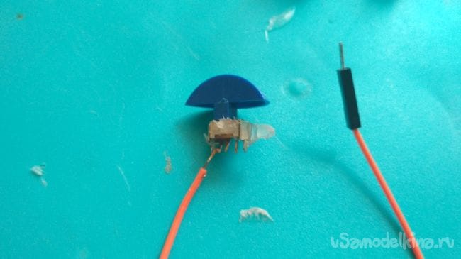 Теперь берём один провод "папа-мама", отрезаем от него выход "мама", зачищаем лудим и припаиваем к выключателю: