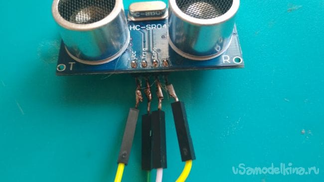 Берём ультразвуковой дальномер и припаиваем к его выходам (vcc, Echo, Trig, Gnd) провода типа "папа-мама":
