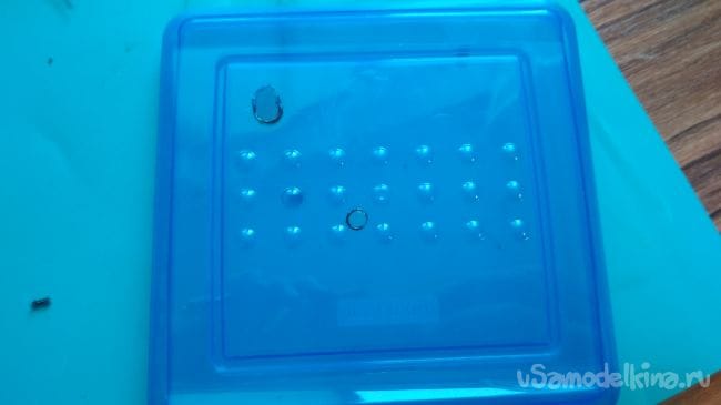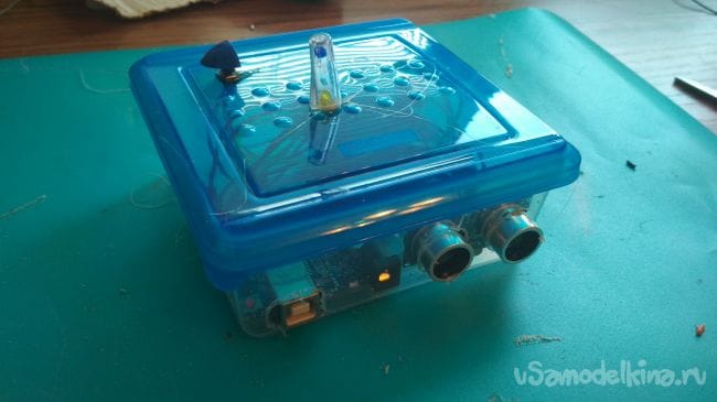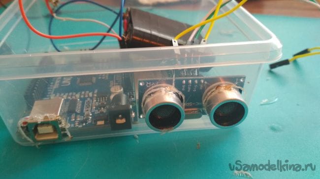 Отмечаем и делаем два отверстия с боку контейнера под ультразвуковой дальномер: