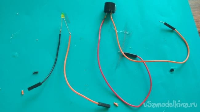 Припаиваем провода "папа" к зуммеру, а провода "мама" к светодиоду: