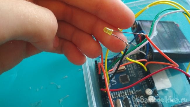 Теперь подключаем соблюдая полярность по одному концу светодиода и зуммера к 10 digital pin на Ардуино, а другие два конца к Gnd.
