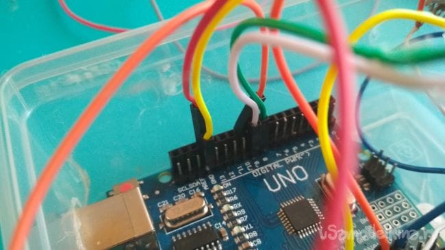 Затем подключаем ультразвуковой дальномер следующим образов к плате Ардуино: vcc к выходу 5 v, Gnd к Gnd, echo к 9 digital пину, а trig к 8
