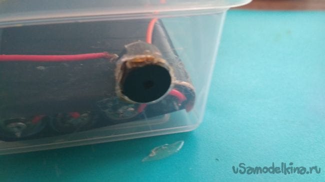 С боковой стороны контейнера делаем ещё одно отверстие под зуммер, после чего вставляем его туда и приклеиваем если это необходимо: