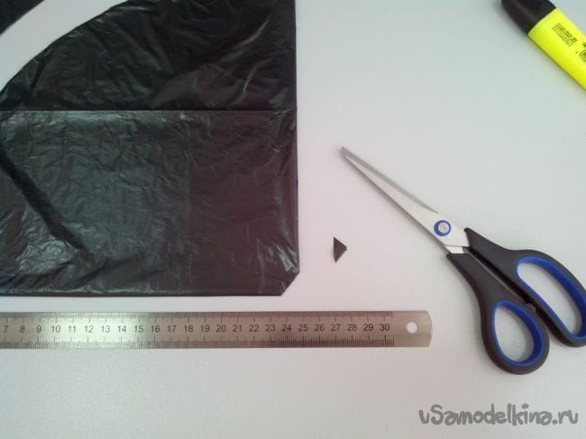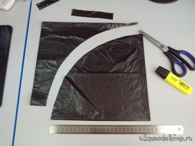 Складываем мешок вчетверо и отрисовываем маркером четверть окружности, центр которой в углу.