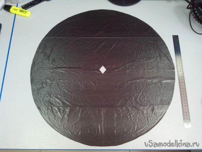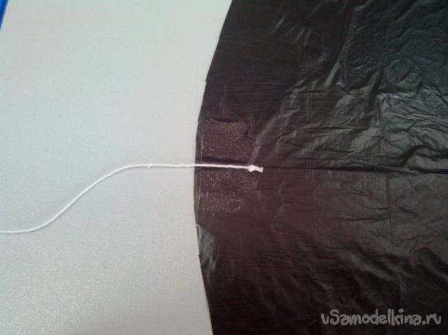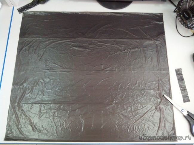 Отрезаем от него нижнюю часть и распрямляем на столе (получается два слоя полиэтилена – для двух парашютов).