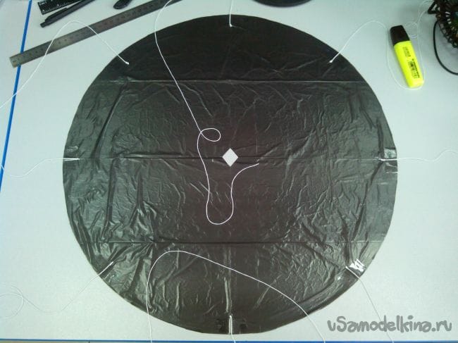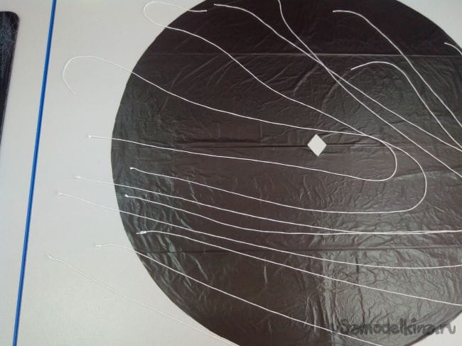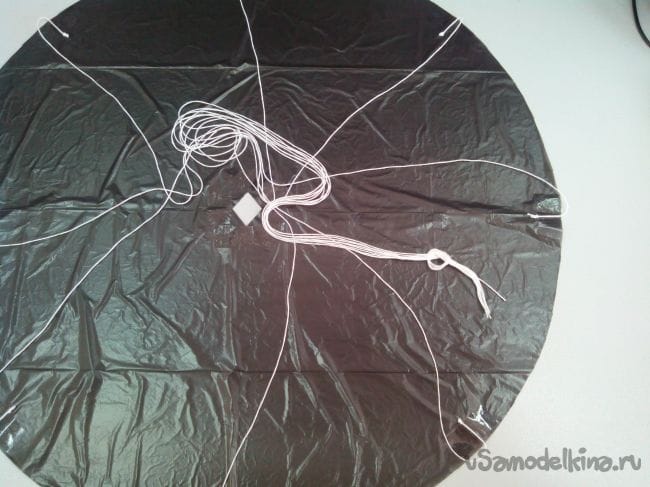 Крепим стропы к куполу полосками узкого скотча, оставляя узелок за полоской скотча.