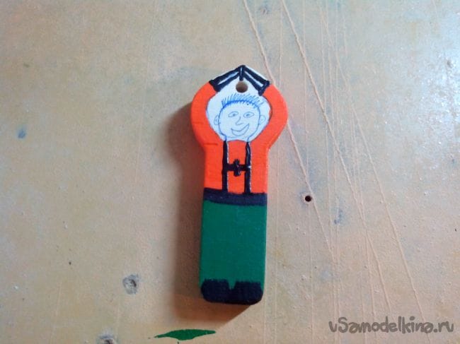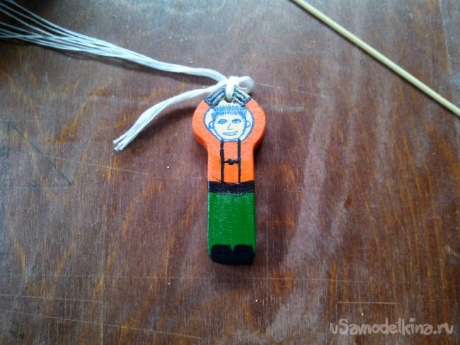 После высыхания лака привязываем стропы к фигурке, продев их через отверстие. Лишние нитки отрезаем.