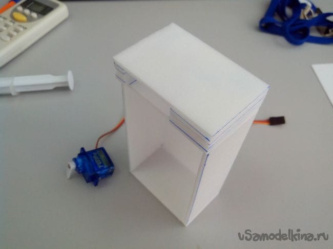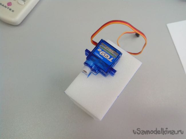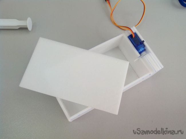 Крышку приклеиваем к качалке сервопривода термоклеем.
