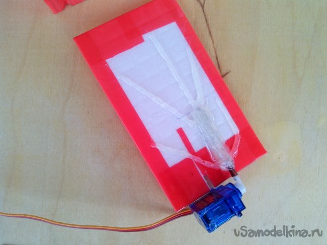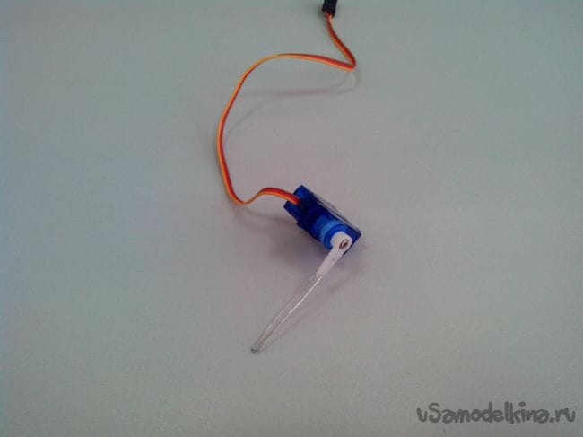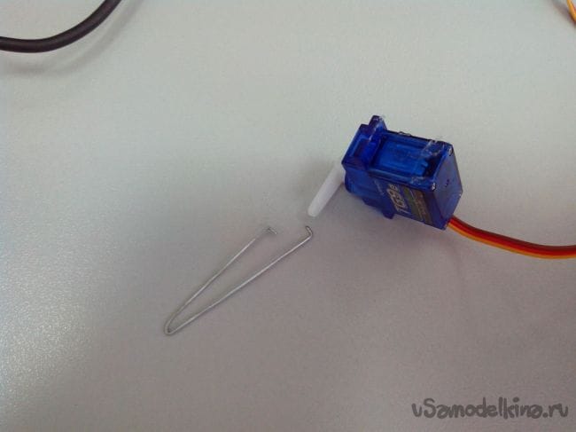 Из скрепки выгибаем удлинение для качалки сервопривода и прикрепляем его. Дополнительно можно обмотать место крепления нитками с клеем или тонкой проволокой.