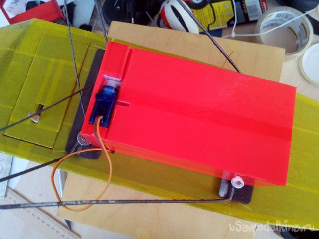 Вклеиваем термоклеем сервопривод в посадочное место, а провод от него протягиваем внутрь фюзеляжа через небольшое отверстие и подключаем к приемнику. В канавке провод можно зафиксировать полоской скотча.