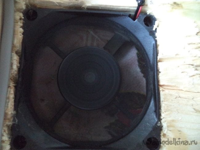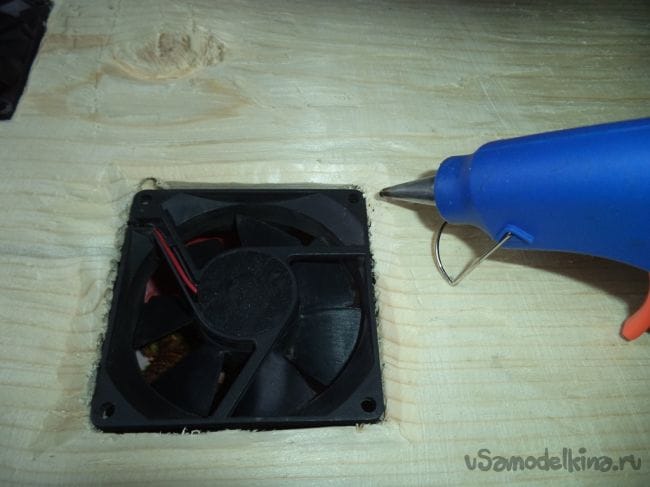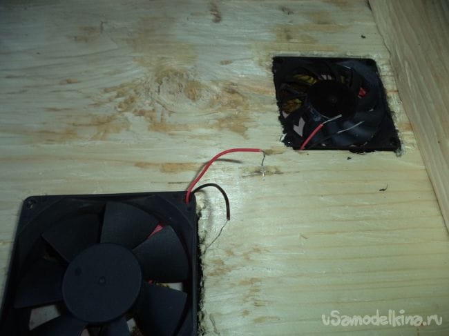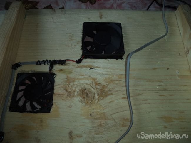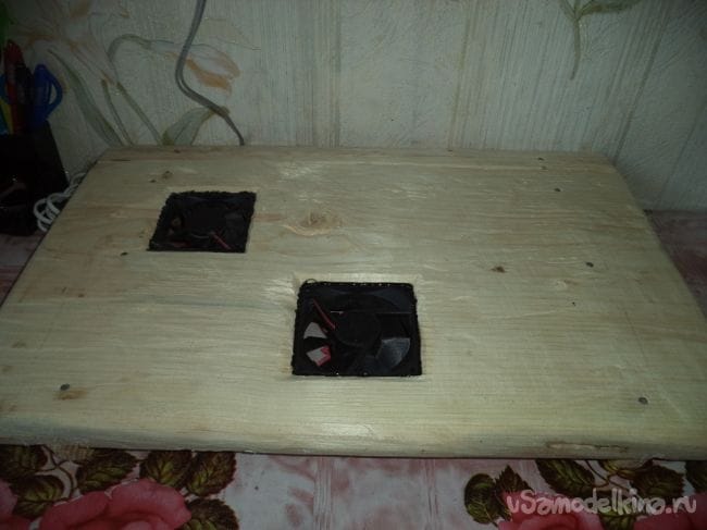Теперь надо сделать отверстия для наших вентиляторов. Для этого берем простой карандаш и по контуру вентиляторов на доске делаем чертежи. Но чтобы они соответствовали с местами засетчатости под ноутбуком, иначе ноутбук хорошо охлаждаться не будет.