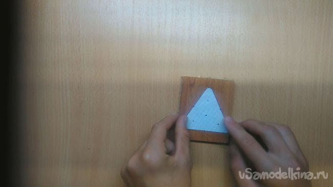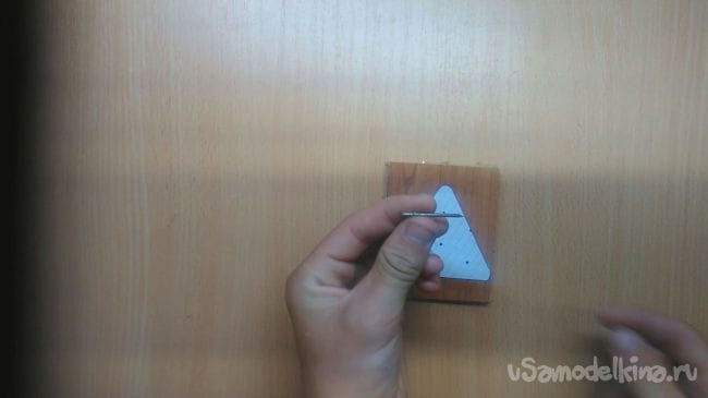 Шаг 1: Первым делом нам необходимо сделать чертёж на бумаге и вырезать его. Затем на заготовку из ламината с помощью скотча закрепляем наш чертёж.