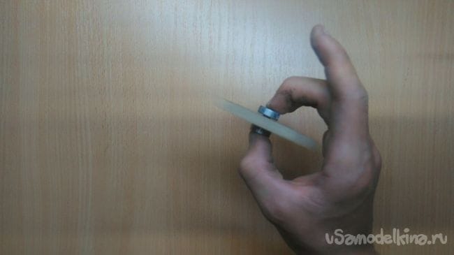 Шаг 5: Чтобы было удобнее держать наш спиннер, берём подшипник и в него вставляем небольшой кусочек дерева в виде цилиндра и фиксируем его клеем. Далее вставляем заготовку в центральный подшипник и с другой стороны точно также как и в первый раз вставляем подшипник ( на фото более понятно