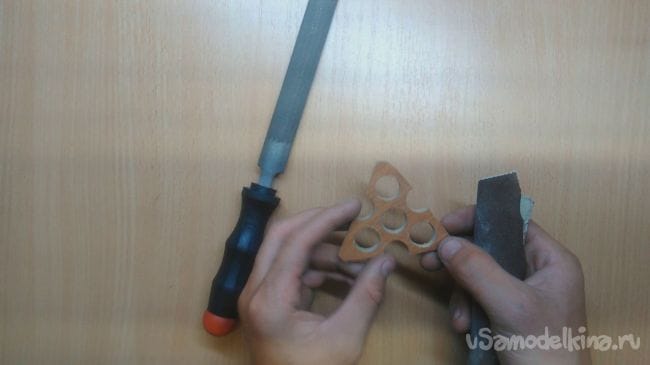 Шаг 3: Затем по контуру с помощью ножовки по металлу вырезаем нашу заготовку. После того как вырезали, закругляем углы напильником. И наждачной бумагой обрабатываем заготовку.