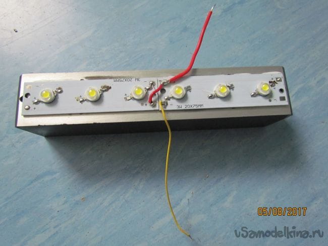 На радиатор приклеил две панельки для пайки светодиодов их шесть штук они по одному ватту и для трёх светодиодов нужно напряжение 9-12В.