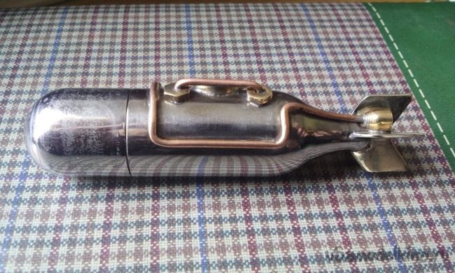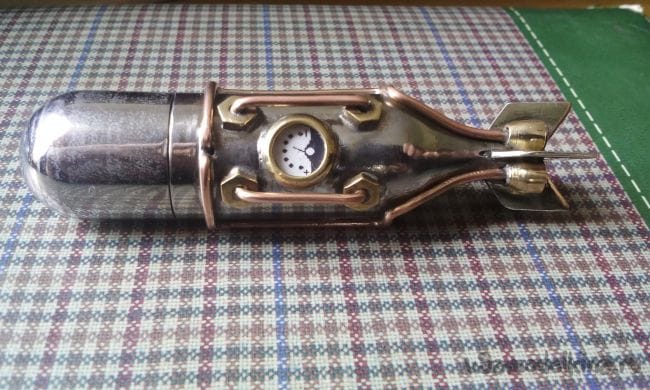 Стабилизаторы вырезал из двух двадцатовиков (20 копеек) СССР. Манометр сделал из штуковины, что на конце шланчика от насоса, которую на золотник накручивают, когда колеса накачивают. Циферблат распечатал на принтере. Для оформления использовал латунные гайки от механических часов и медную проволоку. Паял газовой горелкой.