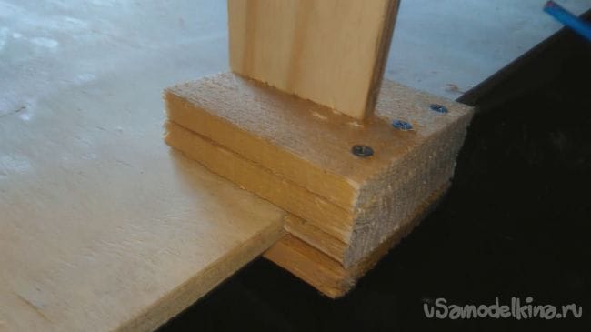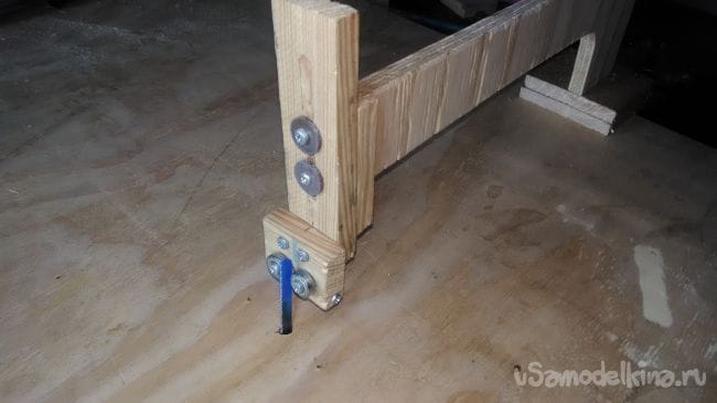 Шаг 3: Далее из фанеры вырезаем г-образную деталь. И к ней прикручиваем небольшой брусок. Далее В этом бруске делаем утопленные гайки. С помощью болтов и гаек фиксируем деталь, которую мы делали во втором шаге.