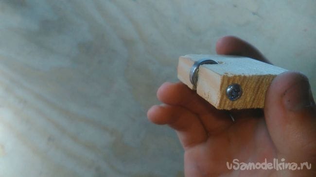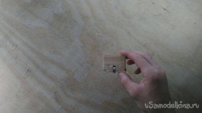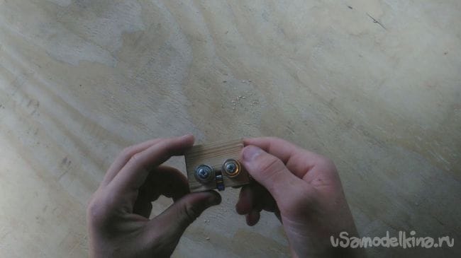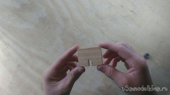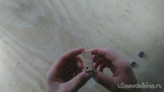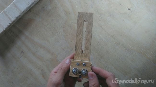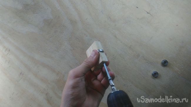 Шаг 1: Первым делом отрезаем небольшой брусочек, и в нем вырезаем паз, чтобы подшипник мог свободно крутиться. Затем сверлим сквозное отверстие, чтобы зафиксировать подшипник. И с помощью длинного болтика фиксируем подшипник так, чтобы он с одной стороны выпирал на 3-4 мм. Далее сверлим 2 отверстия так, чтобы люфт у каждого был по 5-7 мм, как показано на фото. Берём болтик, вставляем его в подшипник, затем шайбу и вставляем в отверстие, которое делали раньше, и фиксируем гайкой. Аналогично делаем другой подшипник.